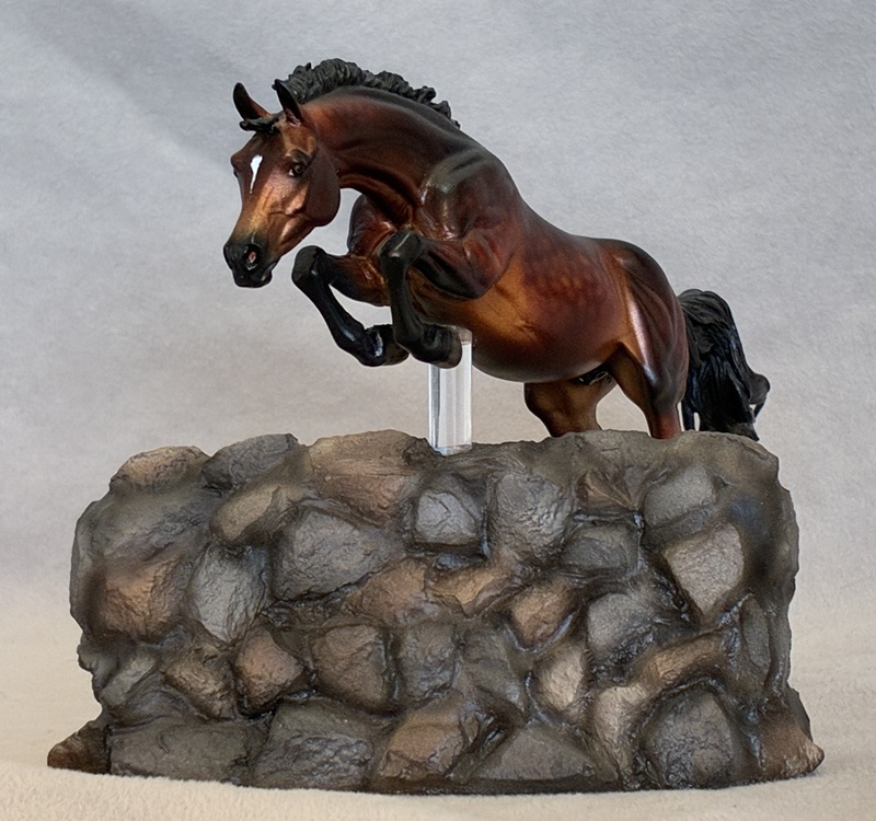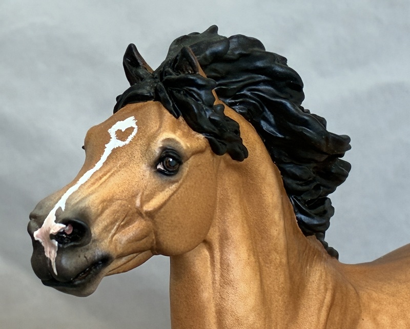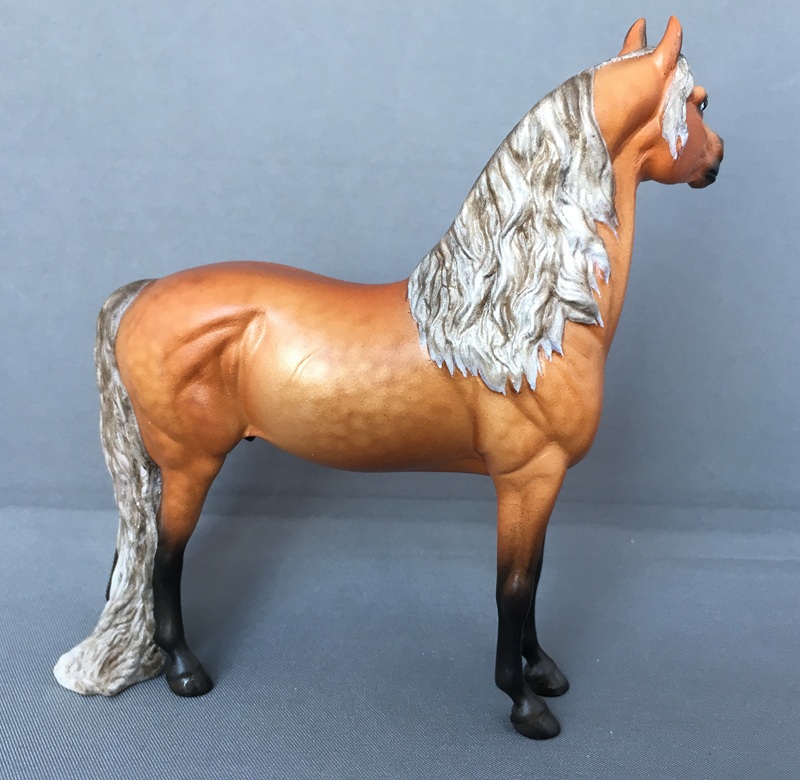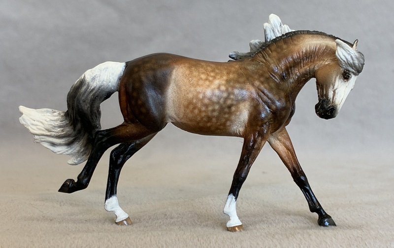 This handsome Stone plastic model (ISH) is painted a dusky dapple buckskin. His seams were sanded and logo removed and his ears and nostrils are refined. He also has beautifully detailed hooves and eyes.