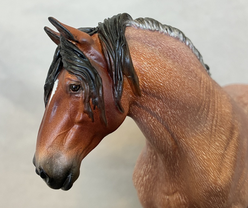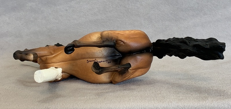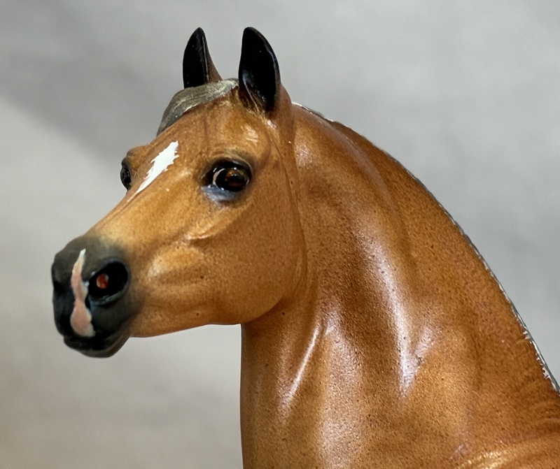 Look at this Breyer plastic Spirit Mustang model, now painted a splashy bay sabino paint! Seams were sanded, logo and “eyebrows” removed along with additional detailing in the muzzle and on the ears. Wowza!