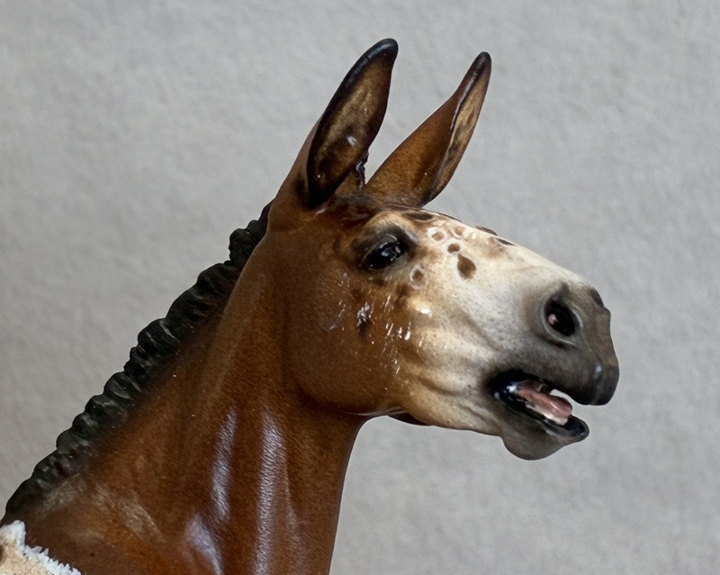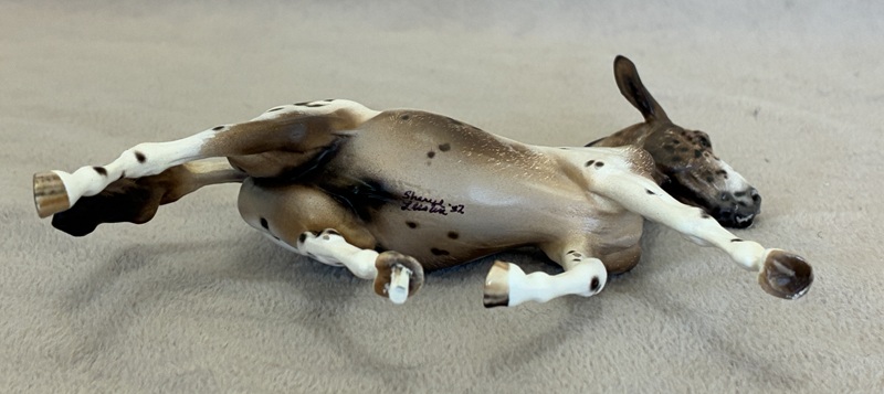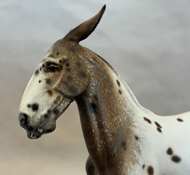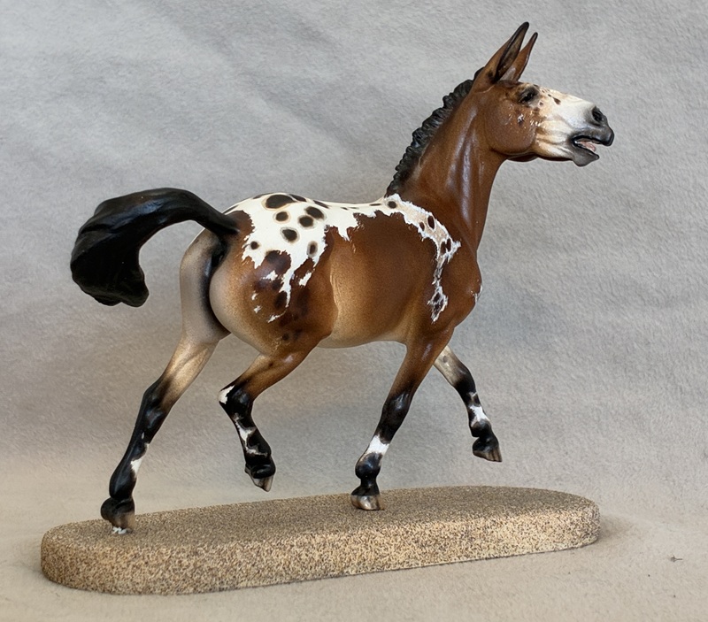 This collector favorite is the Breyer plastic Spirit Mustang model, painted a bold bay semi-leopard Appaloosa. Seams were sanded, logo and “eyebrows” removed along with additional detailing in the muzzle and on the ears. Cool new look!