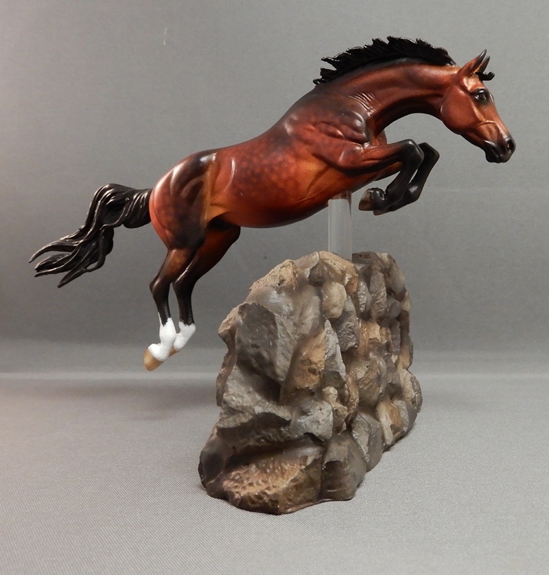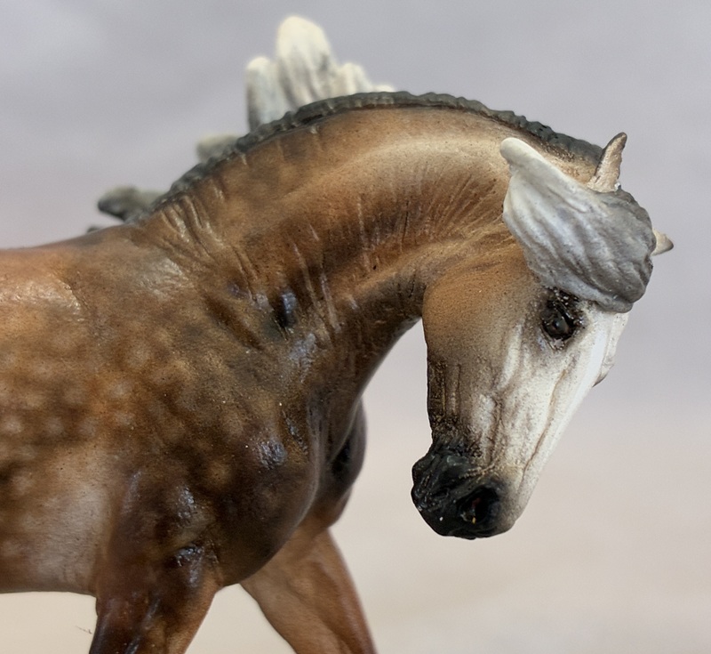This splendid Breyer plastic model (Shagya Arabian) is pastel and painted a magnificent star dapple bay-going-grey with a small star. The mane and tail are custom sculpted. The seams were sanded, the logo was removed, and the hooves and eyes are beautifully detailed. He has a clear acrylic peg in his hind hoof for stability.