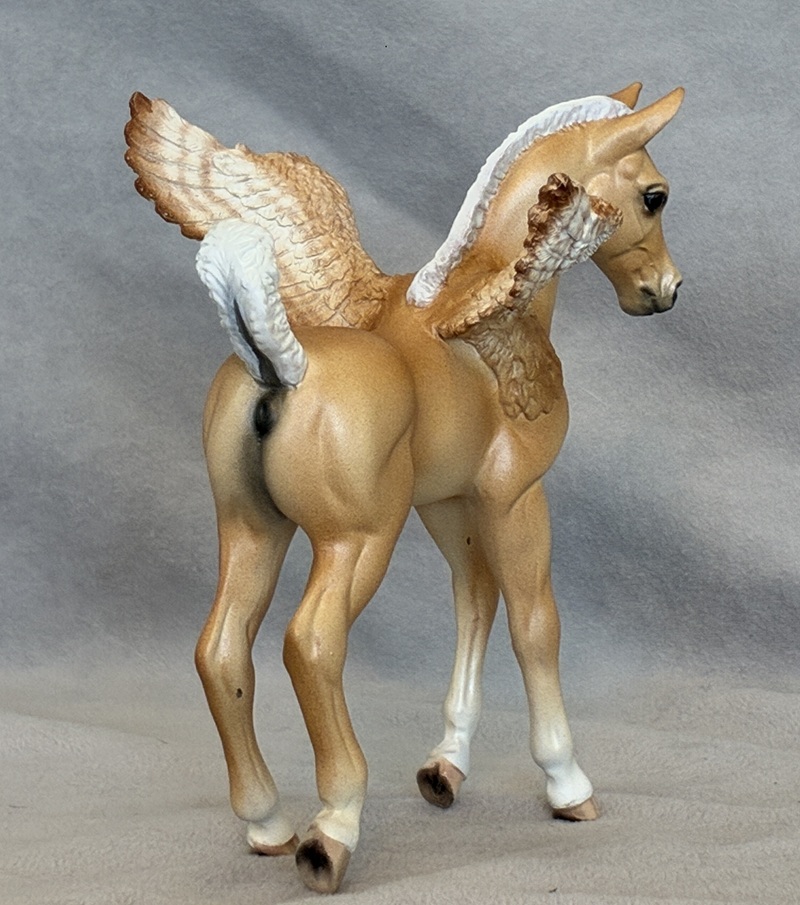 This awesome Pony was sculpted by Kylee Parks and his name is “Zephyr”. He is solid resin, and the tail 90 degrees from the body and held in place by a magnet which allows him to stand upright on his own. The piece is 8 1/2″ tall. He is decorated based on a real Morpho Butterfly with a bit of artistic license on the bird wing pattern and subtle body dappling. He has a lovely expression, and a ton of personality.