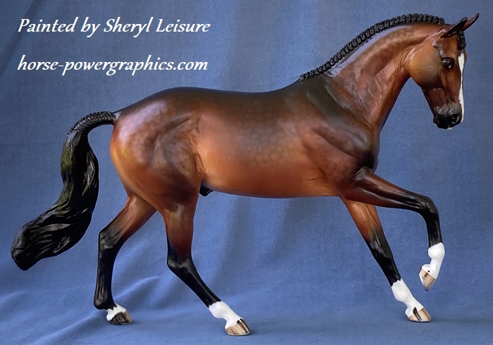 This is a vintage Breyer plastic model painted a glorious dapple bay with high sabino markings and extra etched hair detail. The seams were sanded, the logo was removed, the ears were carved and the hooves and eyes are beautifully detailed.