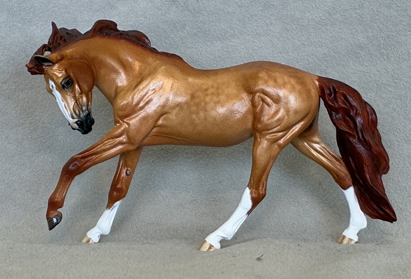This splendid Breyer plastic model (Shagya Arabian) is pastel and painted a magnificent star dapple bay-going-grey with a small star. The mane and tail are custom sculpted. The seams were sanded, the logo was removed, and the hooves and eyes are beautifully detailed. He has a clear acrylic peg in his hind hoof for stability.