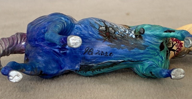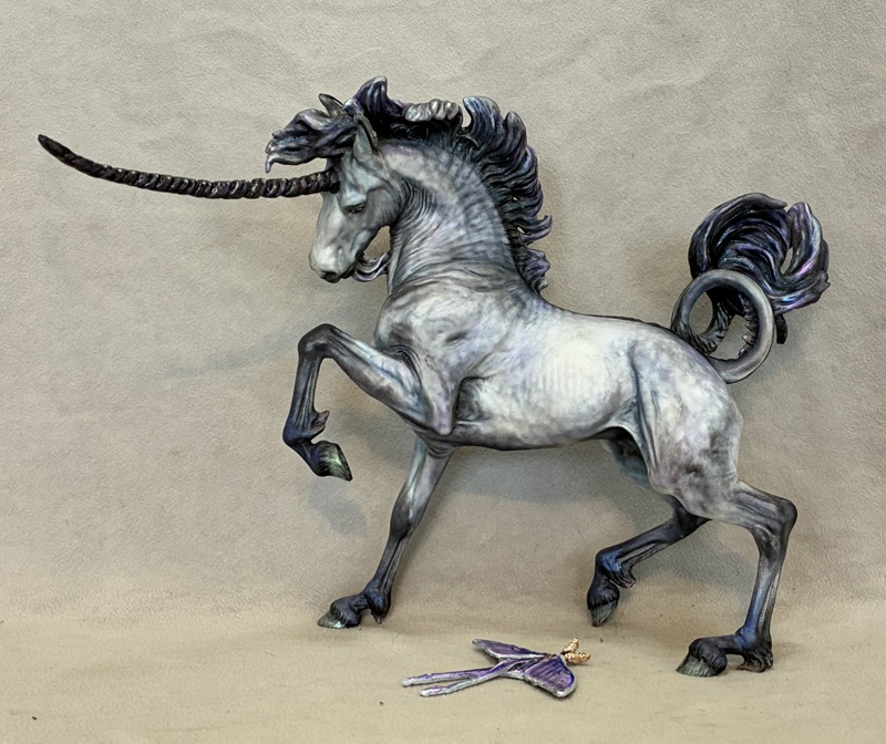 This awesome Pony was sculpted by Kylee Parks and his name is “Zephyr”. He is solid resin, and the tail 90 degrees from the body and held in place by a magnet which allows him to stand upright on his own. The piece is 8 1/2″ tall. He is decorated based on a real Morpho Butterfly with a bit of artistic license on the bird wing pattern and subtle body dappling. He has a lovely expression, and a ton of personality.