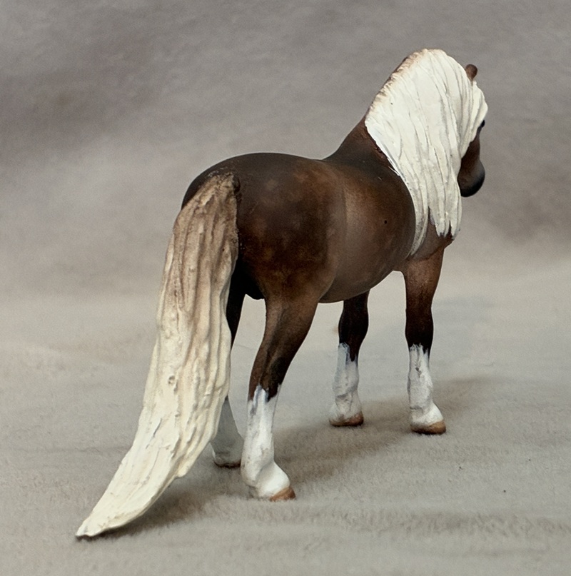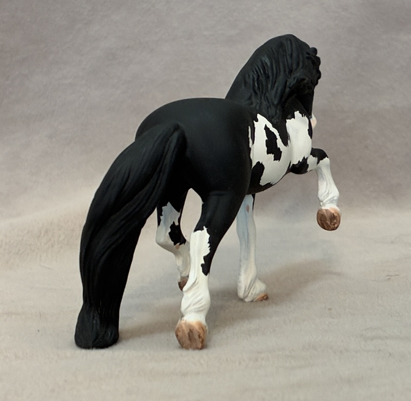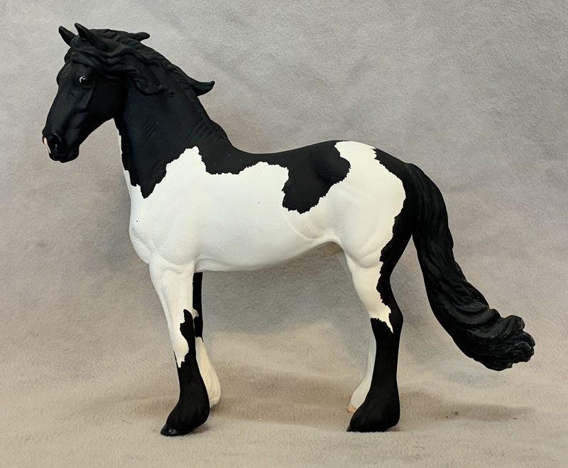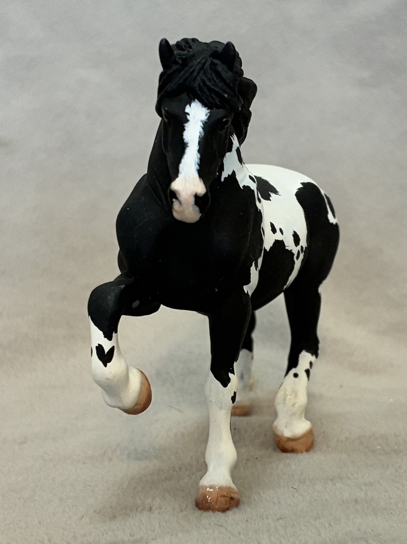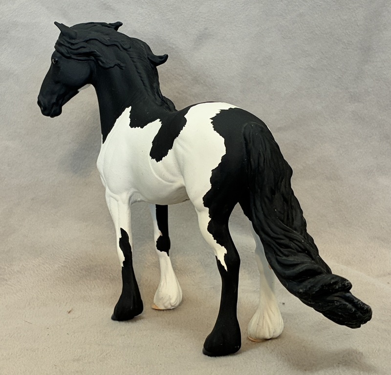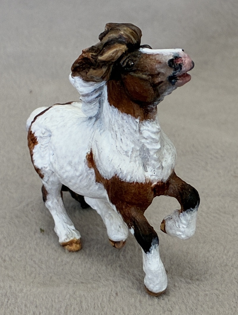 Look at this Breyer plastic Spirit Mustang model, now painted a splashy bay sabino paint! Seams were sanded, logo and “eyebrows” removed along with additional detailing in the muzzle and on the ears. Wowza!