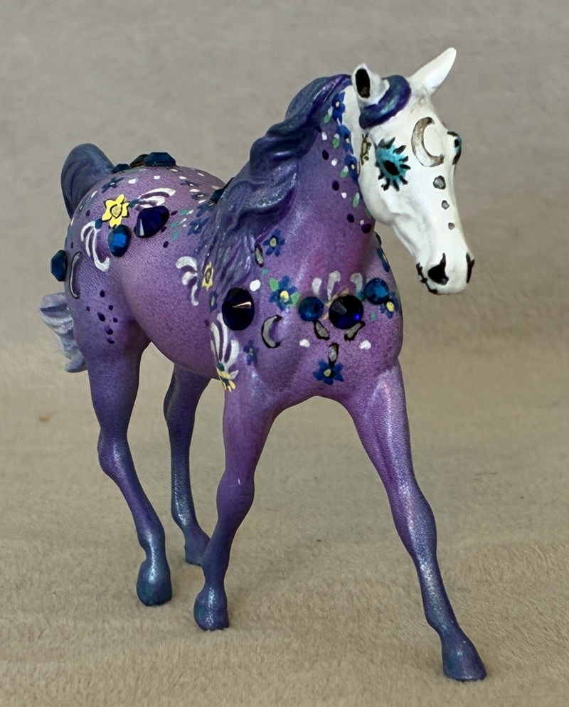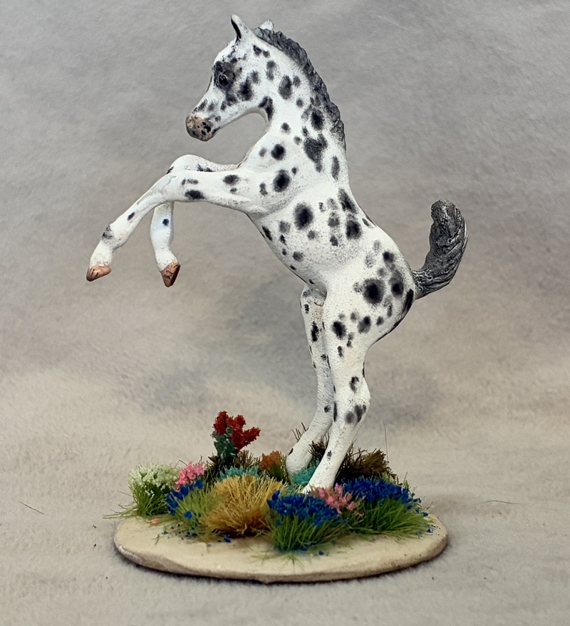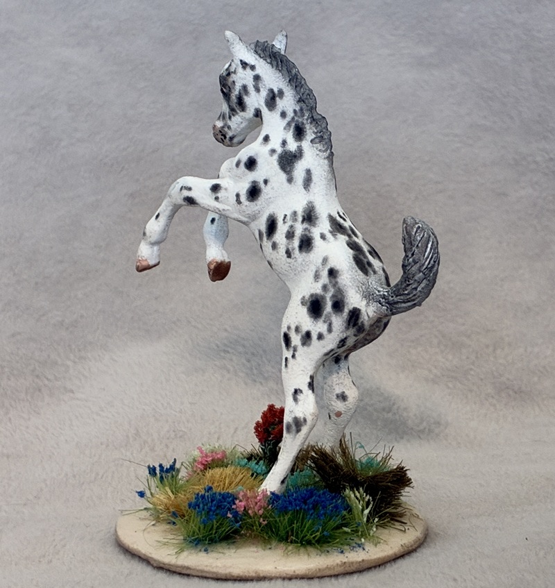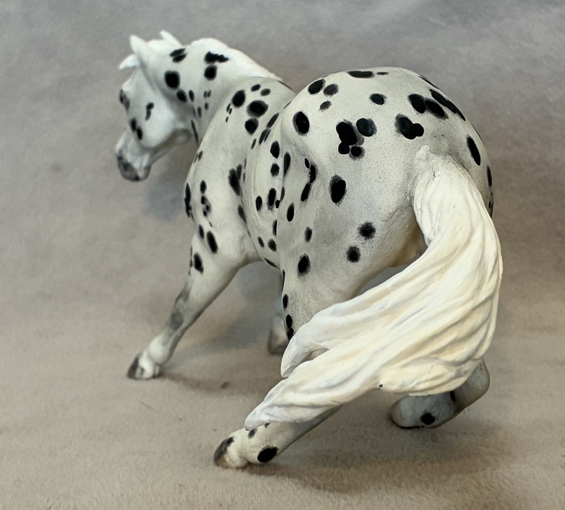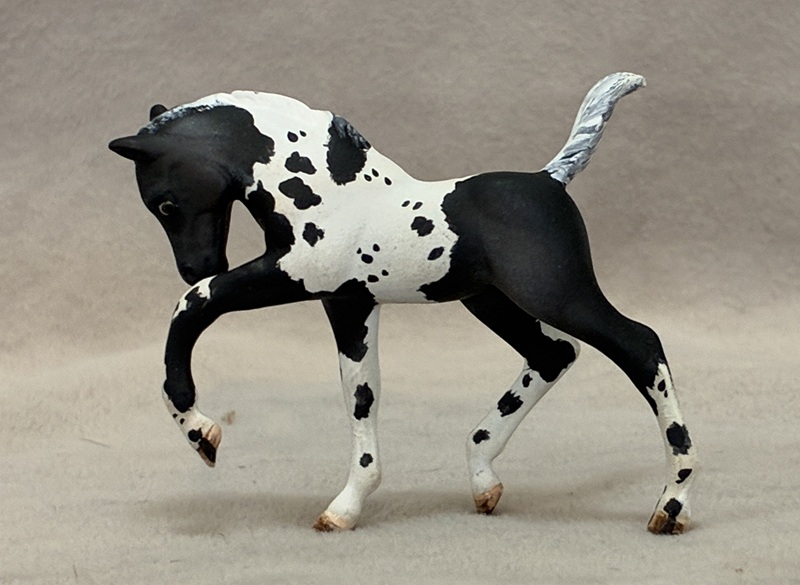 This collector favorite is the Breyer plastic Spirit Mustang model, painted a bold bay semi-leopard Appaloosa. Seams were sanded, logo and “eyebrows” removed along with additional detailing in the muzzle and on the ears. Cool new look!
