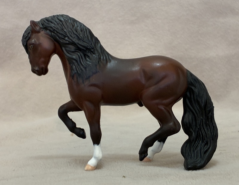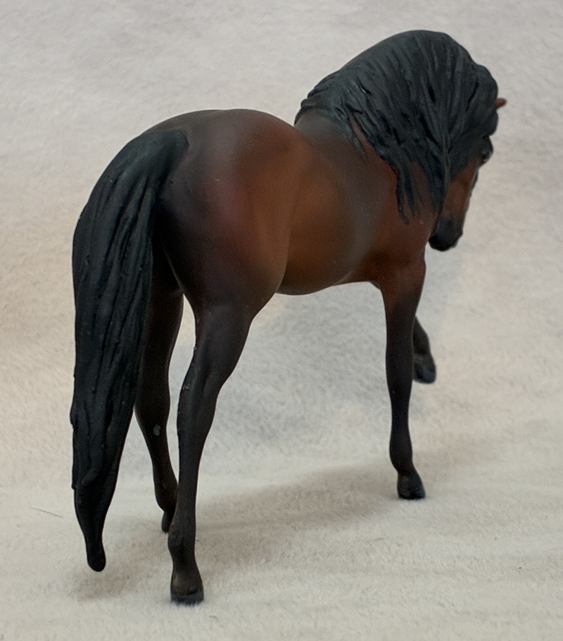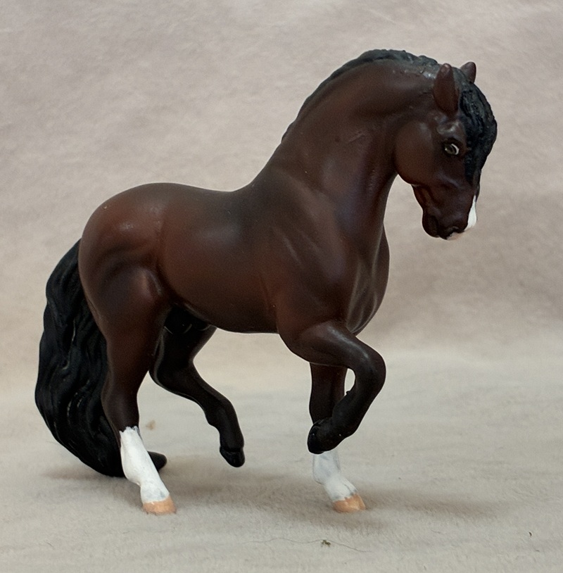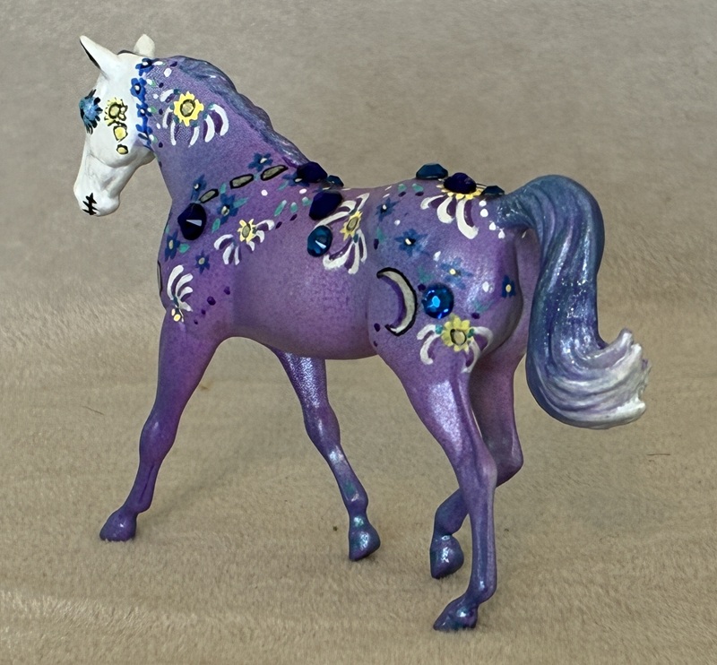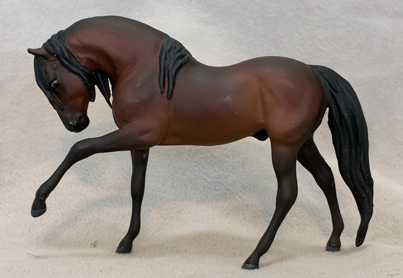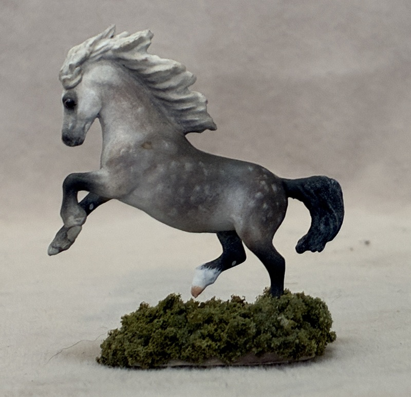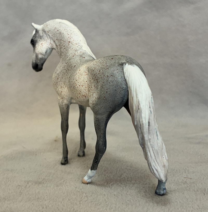 This splendid Breyer plastic model (Shagya Arabian) is pastel and painted a magnificent star dapple bay-going-grey with a small star. The mane and tail are custom sculpted. The seams were sanded, the logo was removed, and the hooves and eyes are beautifully detailed. He has a clear acrylic peg in his hind hoof for stability.