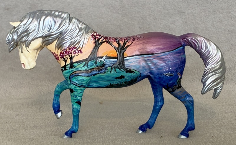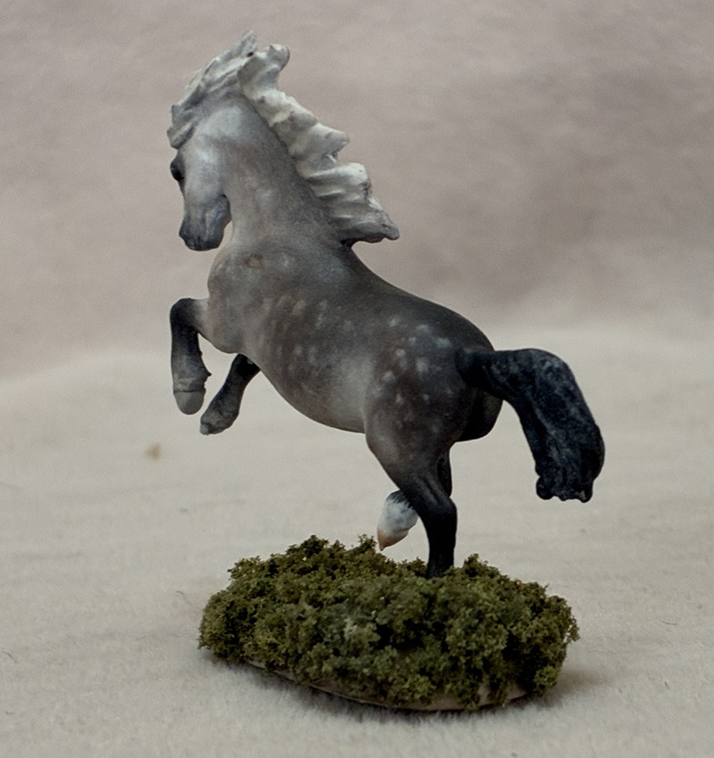 This breathtaking Breyer plastic model is painted a lovely dappled silver bay. He has a completely custom sculpted mane and added gelding parts. The seams were sanded, the logo removed, and the hooves and eyes are beautifully detailed.