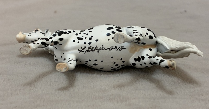 This awesome Pony was sculpted by Kylee Parks and his name is “Wee-Z”. He is solid resin, and the tail flows away which allows him to stand on his own. The piece is 4 1/2″ tall. He is decorated based on a photo of a real Zony (Pony/Zebra cross) with a bit of artistic license on the bird wing pattern. He has a lovely expression, and a ton of personality.