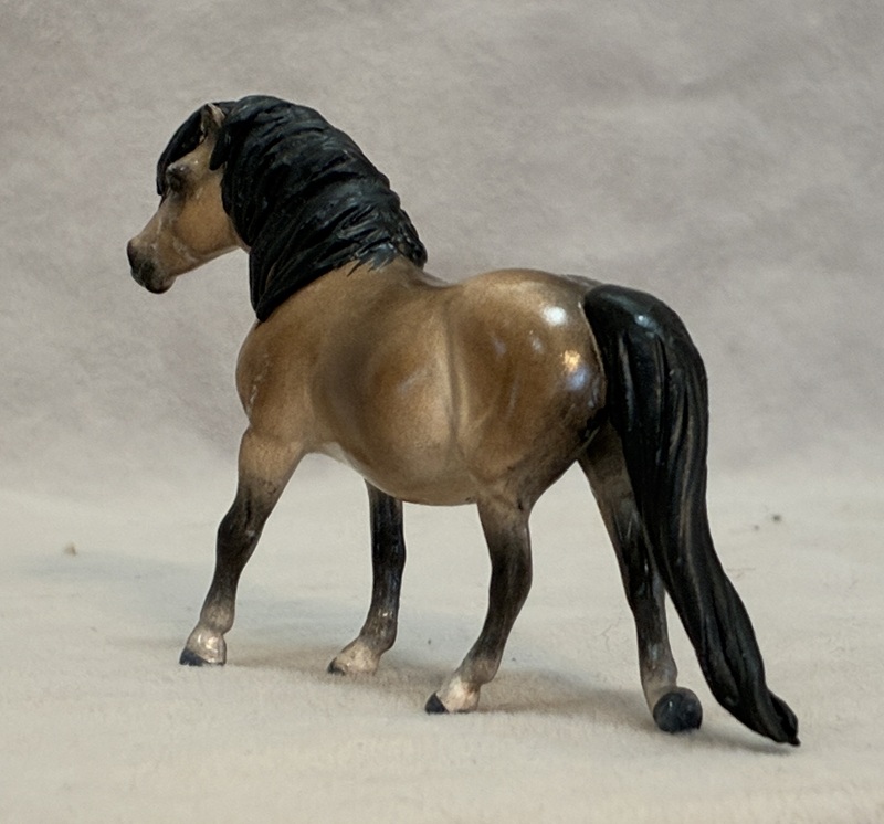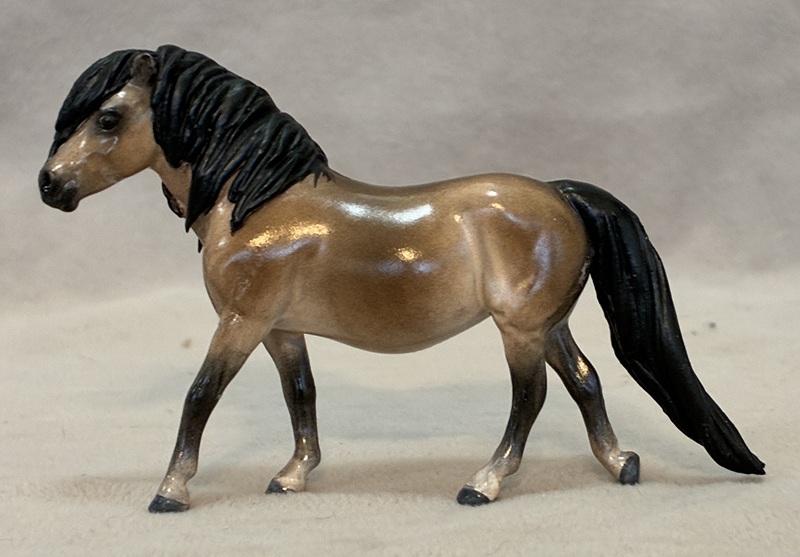This handsome Stone plastic model (ISH) is painted a dusky dapple buckskin. His seams were sanded and logo removed and his ears and nostrils are refined. He also has beautifully detailed hooves and eyes.
