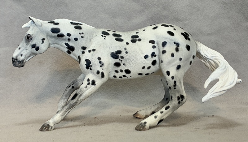 This dazzling Breyer plastic horse (Latigo) is painted an striking black semi-roan loud Appaloosa with lots of hair detail. The forelock and tail have been customized. Seams sanded, logo removed, detailed hooves and eyes, including painted horseshoes.